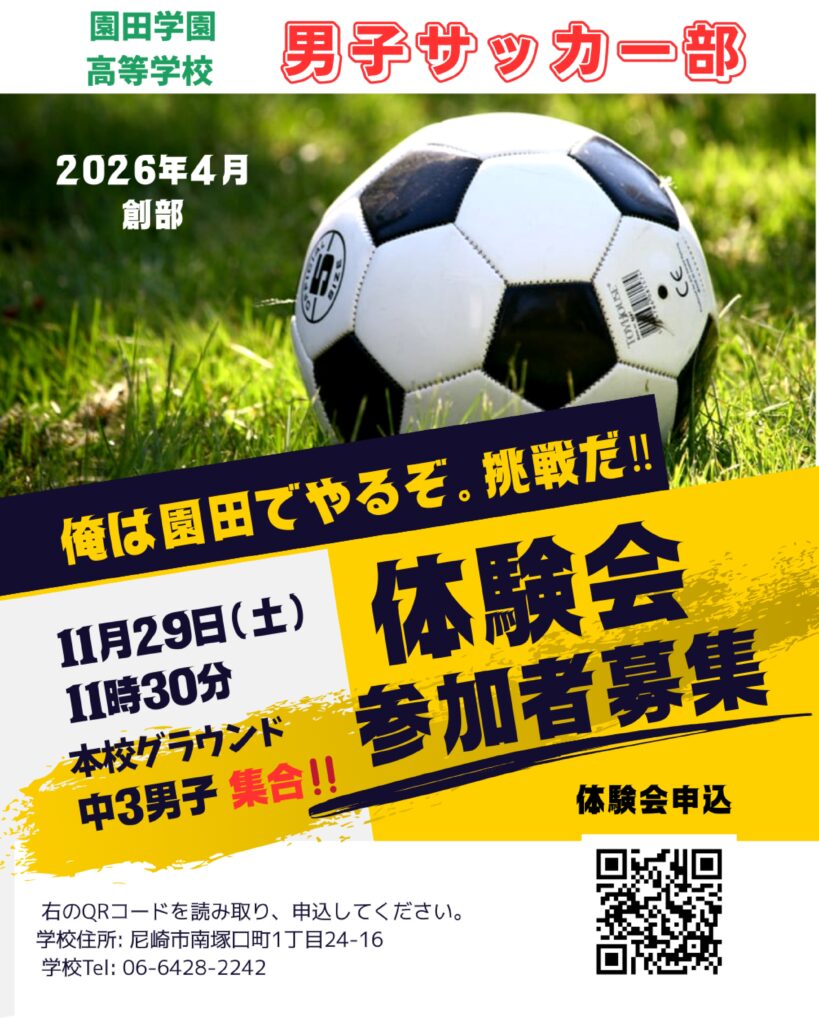 2026年度共学化に伴い、新設する男子サッカー部の練習会を11/29(土)実施予定のオープンキャンパスにて行います。