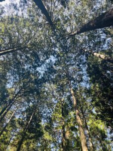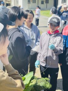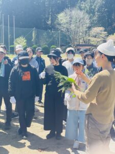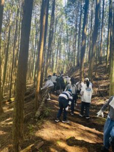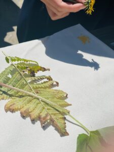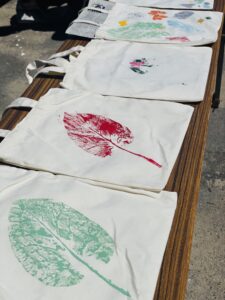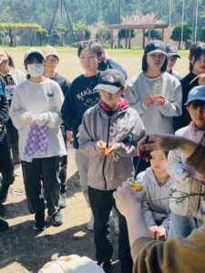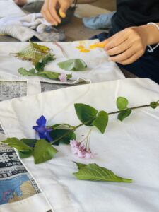 2日目研修はじめは、裏山へ行き「ビオトープ学習」を行いました。杉の木の合間を歩きながら植物や動物のことを教えていただきました。散策中に集めた様々な植物の模様を利用してスタンプも作りました。