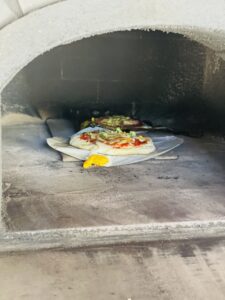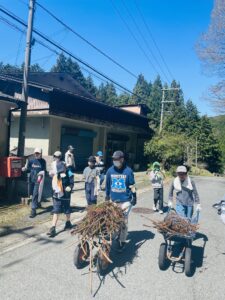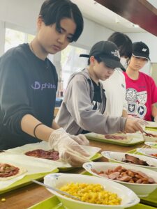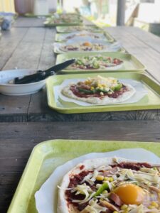 その後昼食のためのピザ作りです。1人一枚ピザ生地から作っていきます。トッピングし、窯で焼いていきます。自然の中で食べる出来立てピザは格別でした。食べ終わるとそのまま焼き板づくりに移ります。