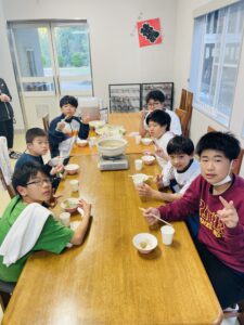 焼き板はまず火起こしからです。なかなか火がつかず苦戦していましたが、どの班も無事火起こし成功。火おこしした焚き火の中に板を入れ真っ黒になるまで焼きます。その後煤を落としておもいおもいのイラストや模様や文字入れをしました。思い出になる作品ができたようです。